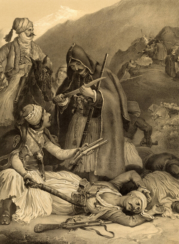 Σκηνή από την Ελληνική Επανάσταση: Ο Γεώργιος Καραϊσκάκης νικά τον οθωμανικό στρατό στην Αράχωβα τον Νοέμβριο του 1826. Λιθογραφία του Peter von Hess, Μόναχο, 1852.