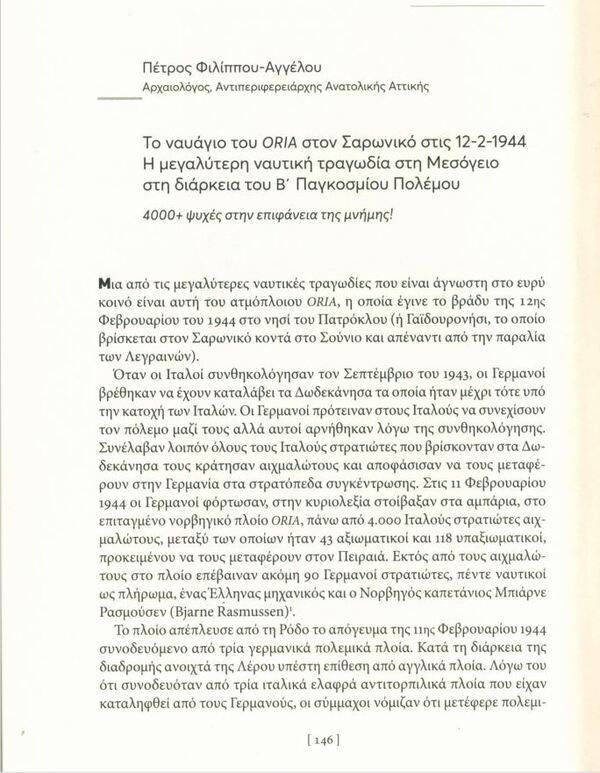 Ψηφιοποιημένο Έγγραφο: Το ναυάγιο του ORIA στον Σαρωνικό στις 12-2-1944. Η μεγαλύτερη ναυτική τραγωδία στη Μεσόγειο στη διάρκεια του Β΄ Παγκόσμιου Πολέμου: 4000+ ψυχές στην επιφάνεια της μνήμης! Description: nauagio.Oria.PDF (pdf) [entire]