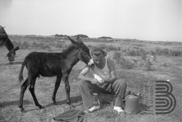 Ψηφιοποιημένη Αρνητικό: Φωτογραφία ενός άντρα με το γαϊδουράκι του που κάθεται σε σκαμνί στην ύπαιθρο