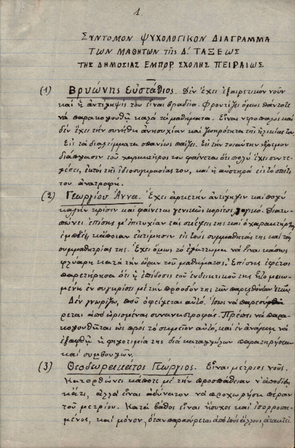 Ψυχολογικό διάγραμμα των μαθητών της Δ’ τάξεως της Δημόσιας Εμπορικής Σχολής Πειραιώς [1937-10-20]