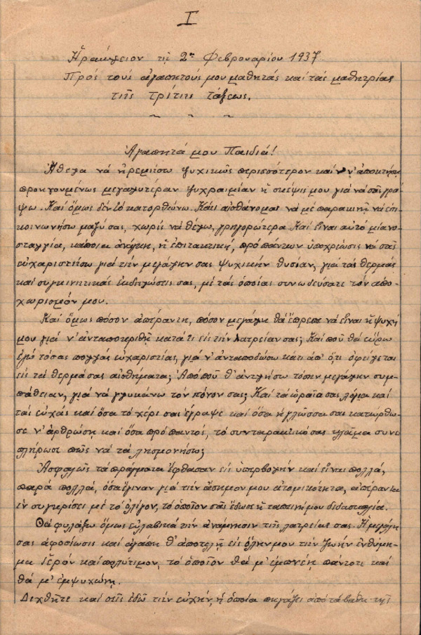 Επιστολή Χ. Πέτρου-Μεσογείτη προς τους μαθητές της Γ΄τάξης