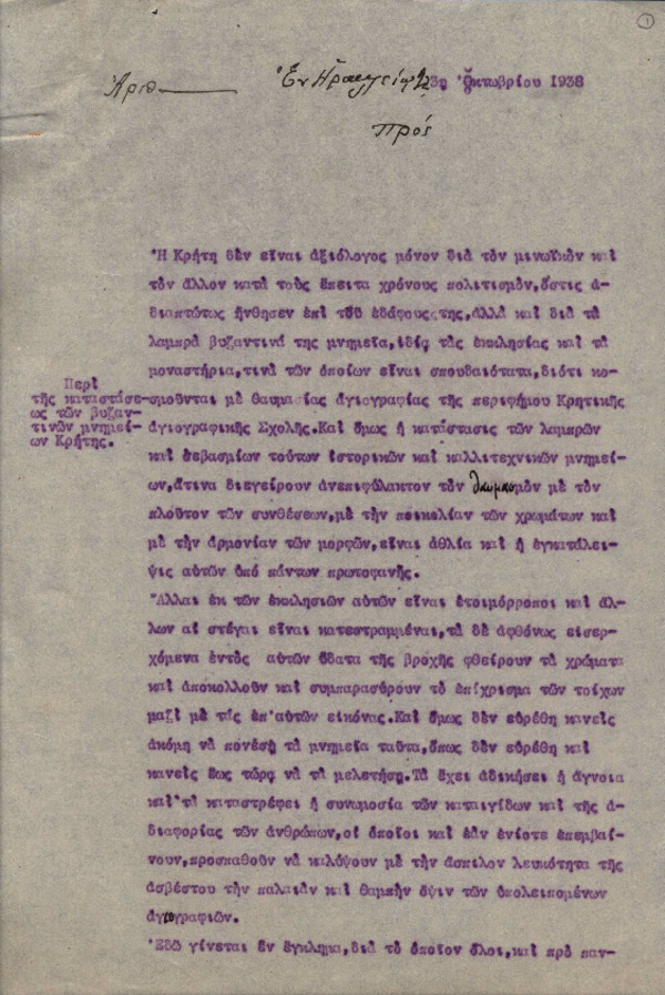 Έκθεση Χ. Πέτρου-Μεσογείτη "Περί της καταστάσεως των βυζαντινών μνημείων Κρήτης" [1938-10-03]