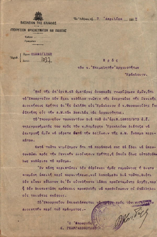 Επιστολή Κ. Γεωργακόπουλου (υπουργού Παιδείας) προς Χ. Πέτρου-Μεσογείτη με θέμα την "Απόρριψη παραιτήσεως" [1937-04-07]