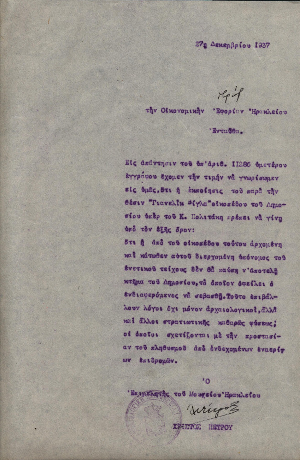 Επιστολή Χ. Πέτρου-Μεσογείτη προς την Οικονομική Εφορία Ηρακλείου με θέμα "Εκποίηση οικοπέδου του Δημοσίου στη θέση «Γιανελίκ Βίγλα»" [1937-12-27]
