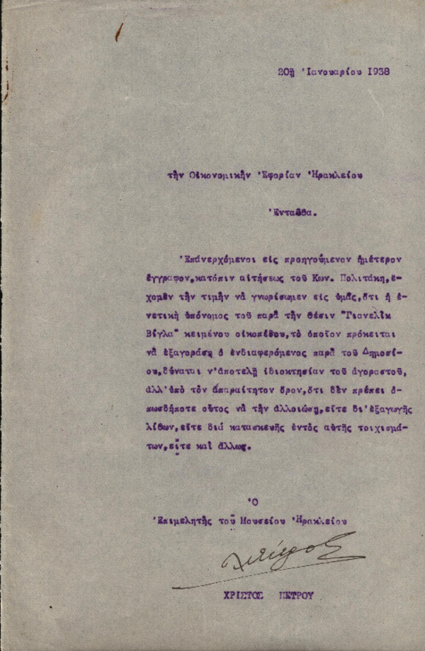 Όροι πώλησης οικοπέδου του Δημοσίου στον Κ. Πολιτάκη στη θέση «Γιανελίκ Βίγλα»
