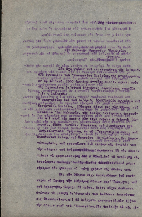 Επιστολή Χ. Πέτρου-Μεσογείτη προς τη Νομαρχία Ηρακλείου με θέμα "Xορήγηση εξηγήσεων σχετικά με άδειες φυλάκων του Μουσείου"