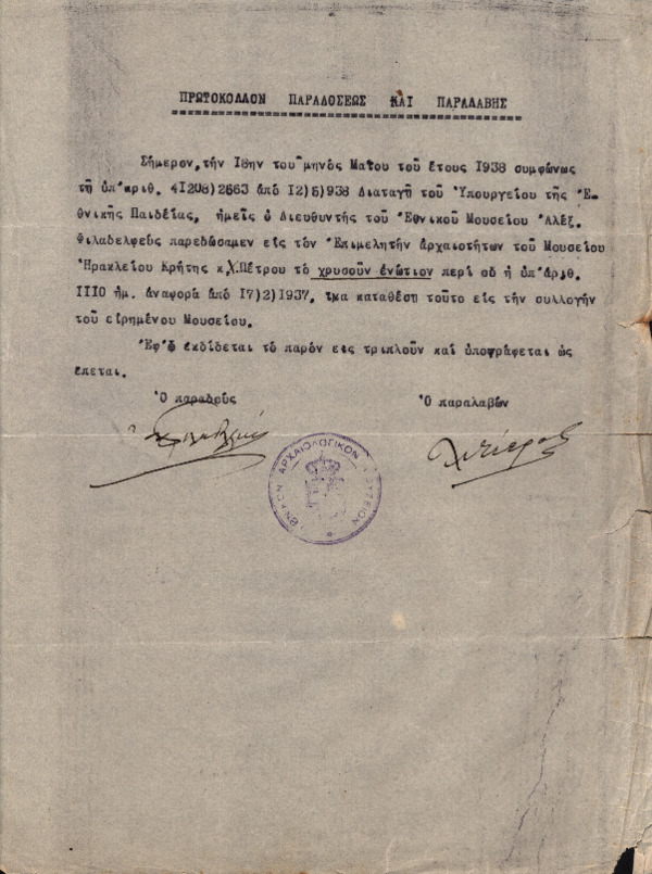 Πρωτόκολλον παραδόσεως και παραλαβής με θέμα "Χρυσό ενώτιο"