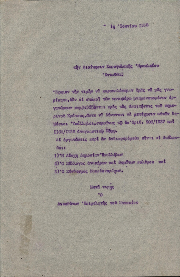 Επιστολή Χ. Πέτρου-Μεσογείτη προς τη Διοίκηση Χωροφυλακής Ηρακλείου με θέμα "Δυνατότητα συμμετοχής δημοσίων υπαλλήλων σε οργανώσεις " [1938-06-01]