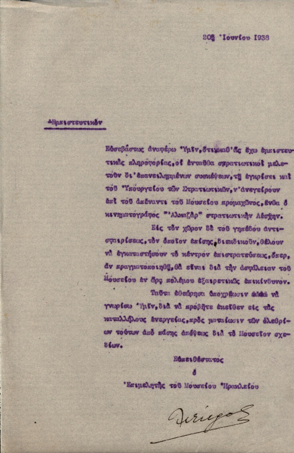 Εμπιστευτικό έγγραφο Χ. Πέτρου-Μεσογείτη με θέμα "Σχεδιασμοί Υπουργείου Στρατιωτικών" [1938-06-20]