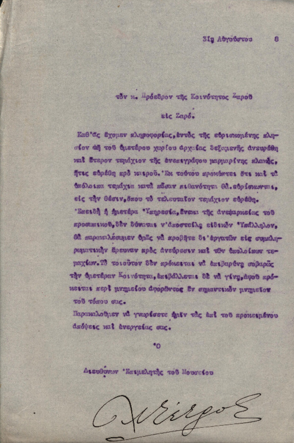 Επιστολή Χ. Πέτρου-Μεσογείτη προς τον Πρόεδρον της Κοινότητας Ζαρού με θέμα "Διενέργεια συμπληρωματικής ανασκαφής" [1938-08-31]