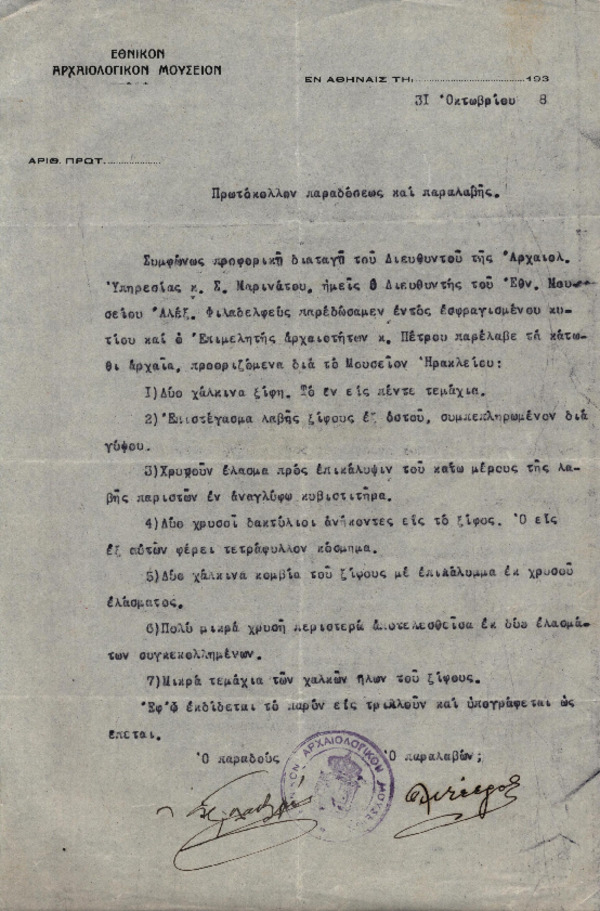 Πρωτόκολλον παραδόσεως και παραλαβής με θέμα "Χάλκινα ξίφη"