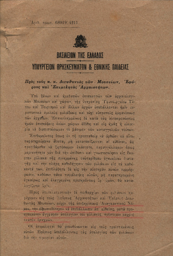 Επιστολή Ν. Σπέντζα (γενικού γραμματέα Υπουργείου Παιδείας) προς Χ. Πέτρου-Μεσογείτη με θέμα την "Ακύρωση προστίμου σε φύλακα αρχαιοτήτων"
