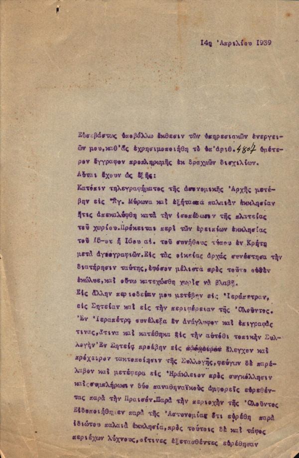 Αναφορά Χ. Πέτρου-Μεσογείτη με θέμα "Έκθεση υπηρεσιακών ενεργειών" [1939-04-14]