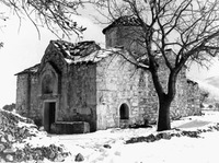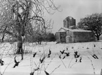 - Φωτογραφία με το χιονισμένο εξωκλήσι της Παναγίας της Μεσοσπορίτισσας, στην περιοχή "Εννέα Πύργοι"