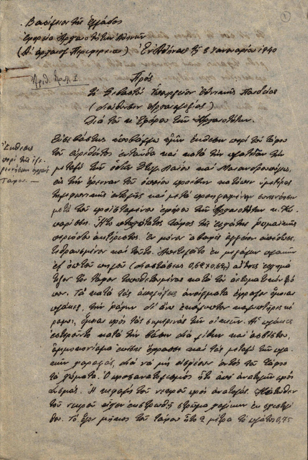 Επιστολή Χ. Πέτρου-Μεσογείτη προς το Υπουργείο Εθνικής Παιδείας-Διεύθυνση Αρχαιολογίας με θέμα "Έκθεση περί της εξερεύνησης αρχαίου τάφου" [1940-01-08]