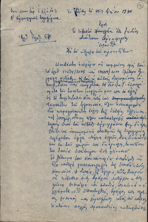 Επιστολή Χ. Πέτρου-Μεσογείτη προς το Υπουργείο Εθνικής Παιδείας -Διεύθυνση Αρχαιολογίας με θέμα "Αυτοψία στο Πυριτιδοποιείο και στο Κουτσικάρι" [1940-05-25]