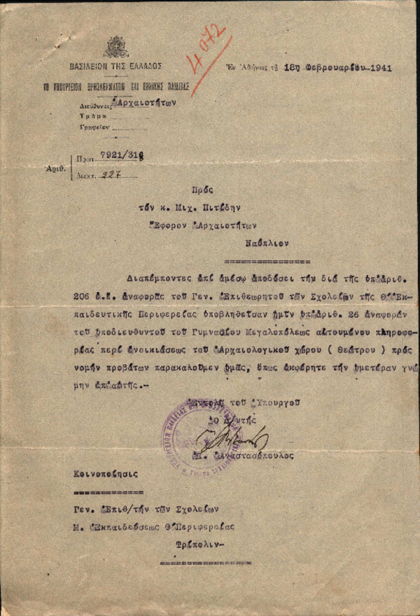 Επιστολή Ι. Αναστασόπουλου (Διευθυντή Αρχαιοτήτων Υπουργείου Παιδείας) προς τον Έφορο Αρχαιοτήτων Ναυπλίου Πιτίδη Μιχ. με θέμα "Ενοικίαση αρχαιολογικού χώρου προς νομή προβάτων"