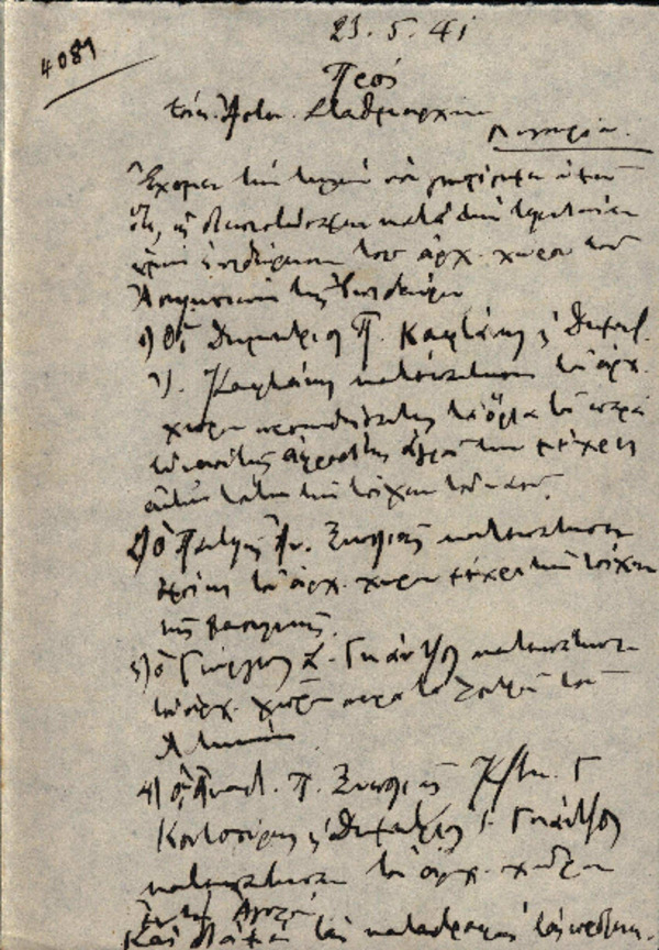 Επιστολή Χ. Πέτρου-Μεσογείτη προς τον Αστυνομικό Σταθμάρχη Λυγουριού με θέμα "Καταγγελία για καταπάτηση αρχαιολογικού χώρου Ασκληπιείου" [1941-05-25]