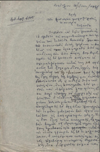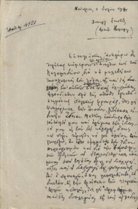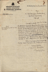 - Επιστολή Χ. Πέτρου-Μεσογείτη προς το Υπουργείο Παιδείας με θέμα "Ανάγκη διορισμού δεύτερου φύλακα στο Μουσείο" [1944-04-09]