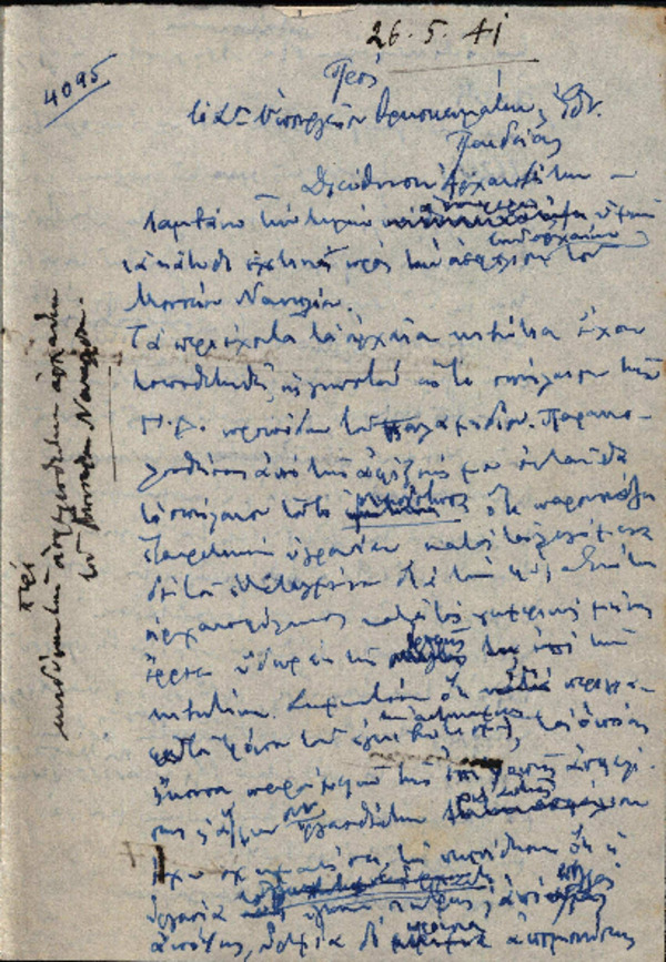 Επιστολή Χ. Πέτρου-Μεσογείτη προς το Υπουργείο Θρησκευμάτων και Εθνικής Παιδείας-Διεύθυνση Αρχαιοτήτων με θέμα "Περί κινδύνων και απολεσθέντων αρχαίων στο Μουσείο Ναυπλίου" [1941-05-26]