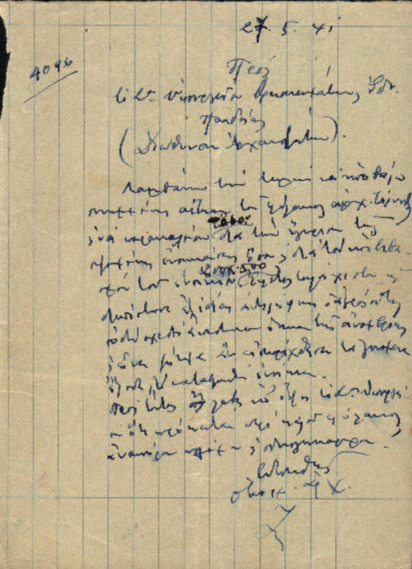 Επιστολή Χ. Πέτρου-Μεσογείτη προς το Υπουργείο Θρησκευμάτων και Εθνικής Παιδείας-Διεύθυνση Αρχαιοτήτων με θέμα "Αίτημα μείωσης ενοικίου" [1941-05-27]
