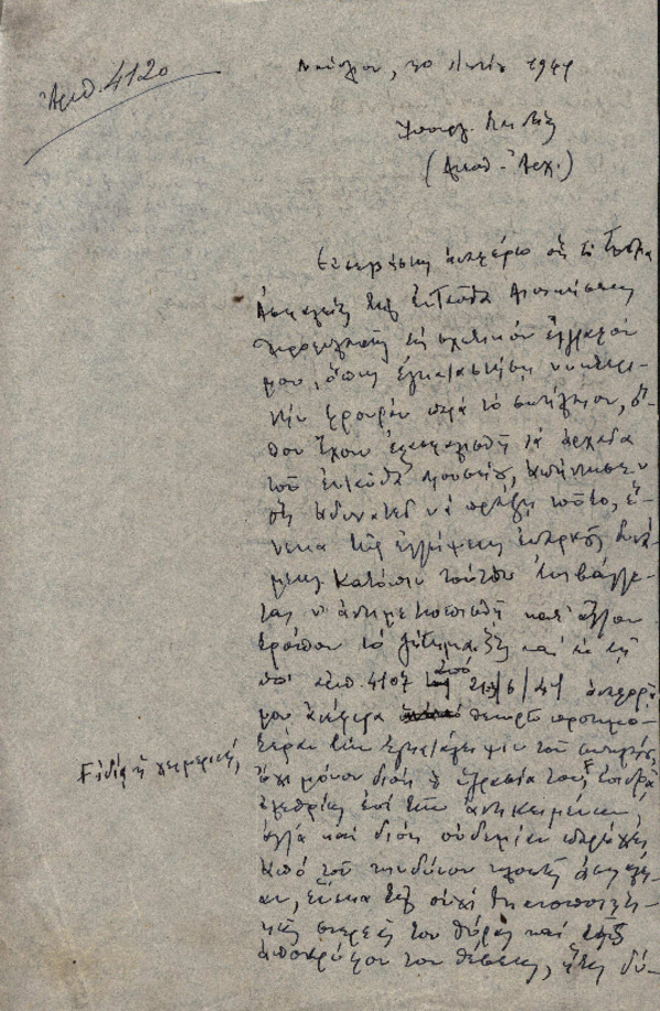 Επιστολή Χ. Πέτρου-Μεσογείτη προς το Υπουργείο Παιδείας-Διεύθυνση Αρχαιολογίας με θέμα "Πρόταση για μεταφορά αρχαίων από το σπήλαιο στο Παλαμήδι στο ισόγειο του Μουσείου" [1941-06-30]