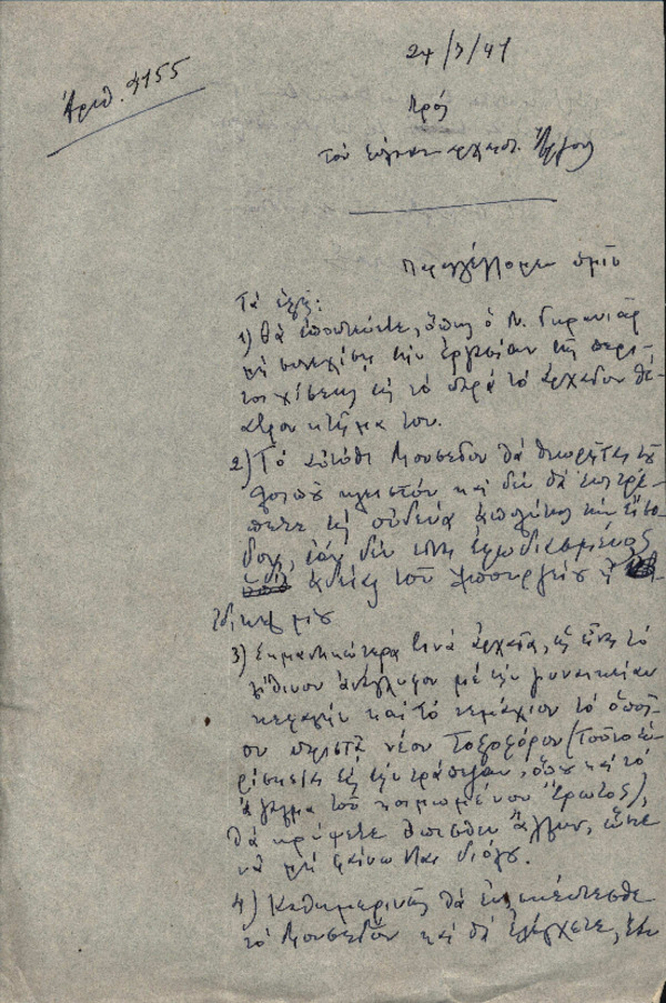 Επιστολή Χ. Πέτρου-Μεσογείτη προς τον φύλακα αρχαιοτήτων Άργους με θέμα "Οδηγίες για την άσκηση των καθηκόντων του" [1941-07-24]