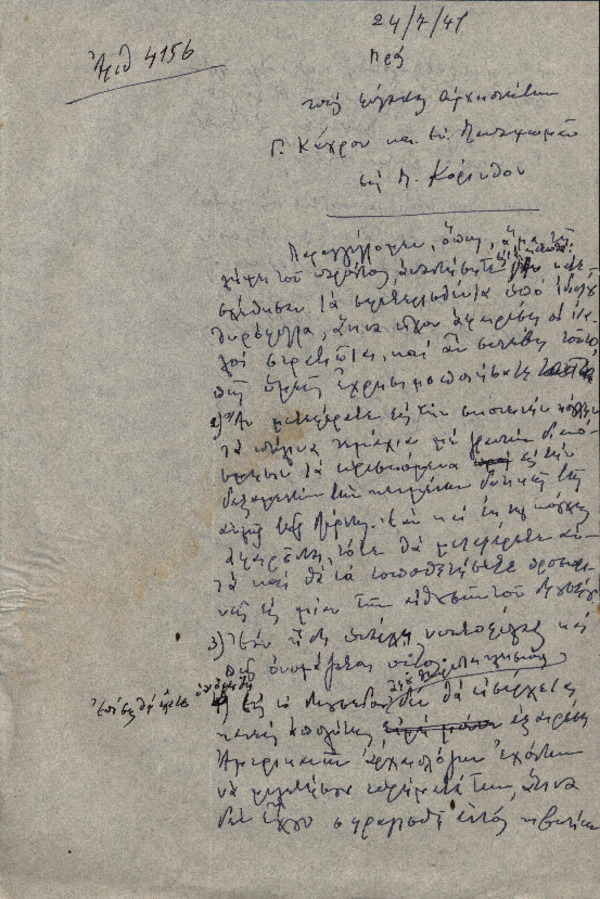 Επιστολή Χ. Πέτρου-Μεσογείτη προς τoυς φύλακες αρχαιοτήτων Παλαιάς Κορίνθου με θέμα "Οδηγίες για την άσκηση των καθηκόντων τους" [1941-07-24]