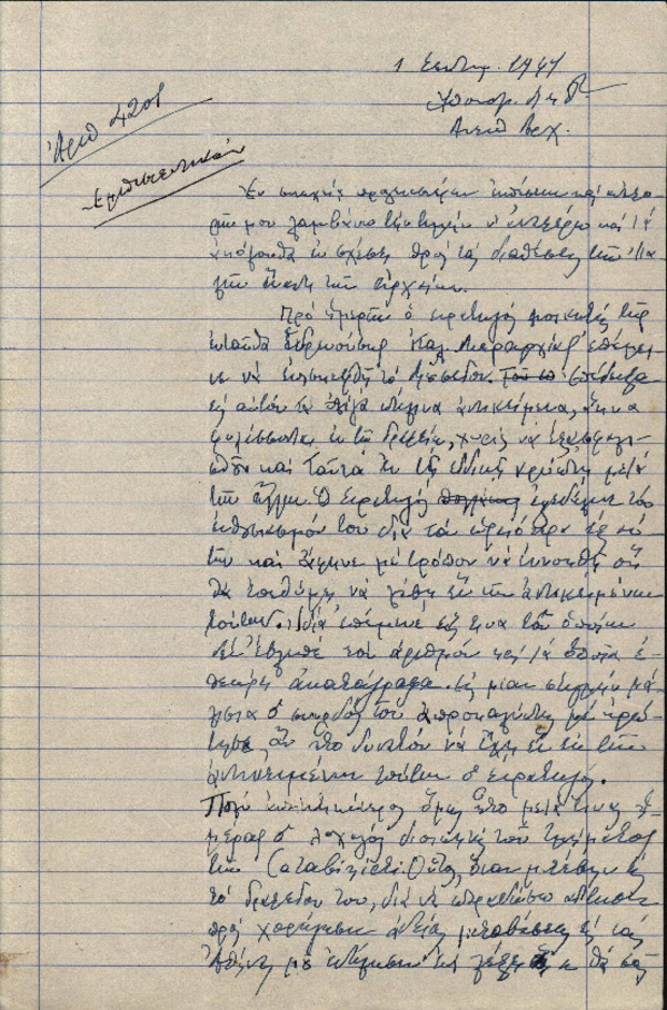 Επιστολή Χ. Πέτρου-Μεσογείτη προς το Υπουργείο Παιδείας-Διεύθυνση Αρχ. με θέμα "Επιθυμία Ιταλών στρατιωτών να αποκτήσουν ευρήματα του Μουσείου" [1941-09-01]