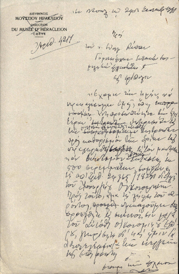 - Επιστολή Χ. Πέτρου-Μεσογείτη προς τον έκτακτο επιμελητή αρχαιοτήτων κ. Ευάγγελο Ρέπα και τον οικονομικό έφορο Μαντίνειας με θέμα "Συμμετοχή στην επιτροπή καθορισμού ορίων παραχωρηθείσας έκτασης" [1941-09-24]