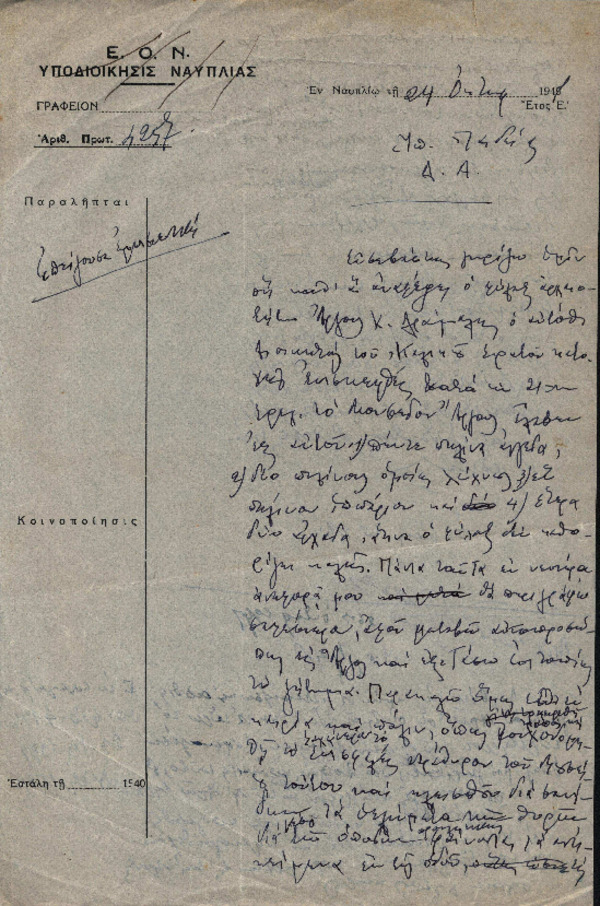 Επιστολή Χ. Πέτρου-Μεσογείτη προς το Υπουργείο Παιδείας-Δ. Α. με θέμα "Απόσπαση αρχαιολογικών ευρημάτων του Μουσείου Άργους από τον Ιταλό Διοικητή"