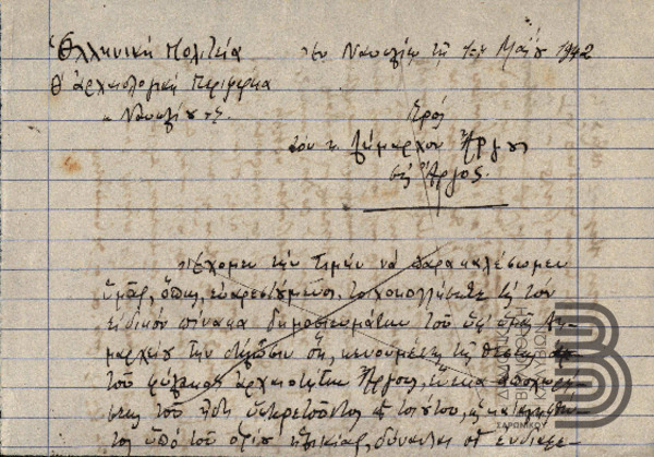 Επιστολή Χ. Πέτρου-Μεσογείτη προς τον Δήμαρχο Άργους με θέμα "Ανακοίνωση για την κένωση θέσης φύλακα αρχαιοτήτων" και προς άγνωστο παραλήπτη "Παράνομη βόσκηση εντός του αρχαιολογικού χώρου Κορίνθου" [1942-05-01] - Identifier: 4327