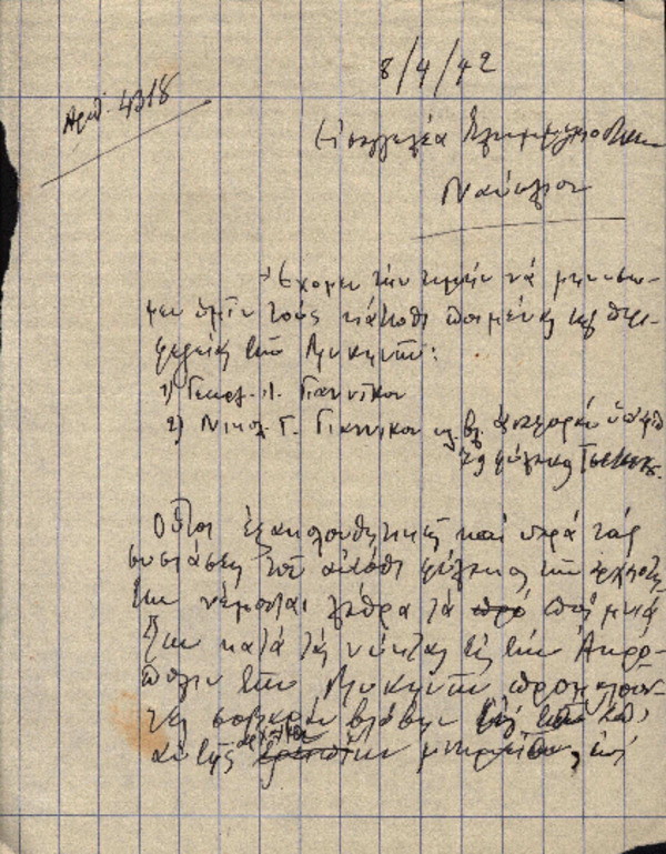 Επιστολή Χ. Πέτρου-Μεσογείτη προς τον Εισαγγελέα Πλημμελειοδικών Ναυπλίου με θέμα "Μήνυση σε κτηνοτρόφους για βόσκηση εντός του αρχαιολογικού χώρου των Μυκηνών"