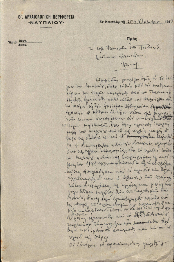 Επιστολή Χ. Πέτρου-Μεσογείτη προς το Υπουργείο Εθνικής Παιδείας-Διεύθυνση Αρχαιοτήτων με θέμα "Αναφορά των ζημιών που προκάλεσε στο μουσείο ο ιταλικός στρατός πριν αποχωρήσει"