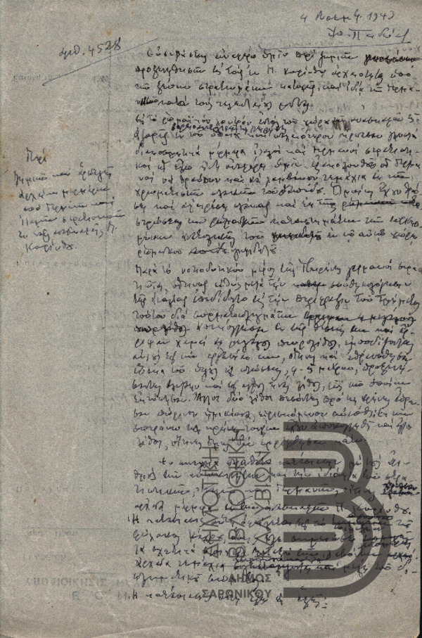 Επιστολή Χ. Πέτρου-Μεσογείτη προς το Υπουργείο Παιδείας με θέμα "Περί ζημιών και αρπαγών αρχαίων από Γερμανούς και Ιταλούς στρατιώτες στην Παλαιά Κόρινθο" [1943-11-04]