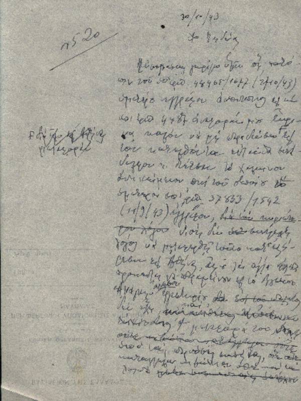 Επιστολή Χ. Πέτρου-Μεσογείτη προς το Υπουργείο Παιδείας με θέμα "Μεταφορά χάλκινου αντικειμένου στην Αθήνα" [1943-10-30]