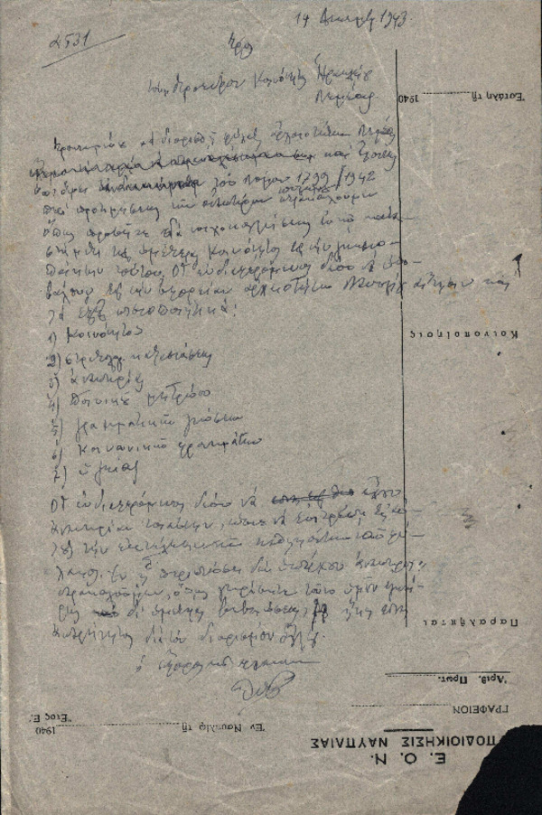 Επιστολή Χ. Πέτρου-Μεσογείτη προς τον Πρόεδρο Κοινότητας Ηρακλείου Νεμέας με θέμα "Προκήρυξη θέσης φύλακα αρχαιοτήτων" [1943-12-14]