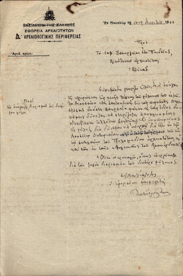 - Επιστολή Χ. Πέτρου-Μεσογείτη προς το Υπουργείο Εθνικής Παιδείας-Διεύθυνση Αρχαιοτήτων με θέμα "Περί της ανάγκης διορισμού του δεύτερου φύλακα" και "Εργασίες γερμανικών στρατιωτικών δυνάμεων στην Τίρυνθα" [1944-04-10]