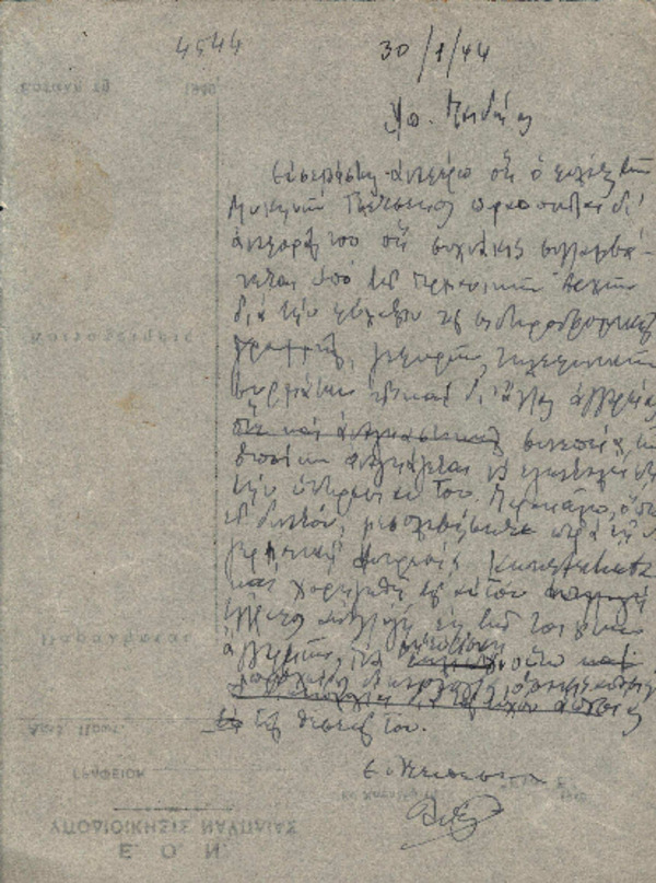 Επιστολή Χ. Πέτρου-Μεσογείτη προς το Υπουργείο Παιδείας με θέμα "Αίτημα απαλλαγής φύλακα αρχαιοτήτων από τις αγγαρείες της γερμανικής κατοχής"