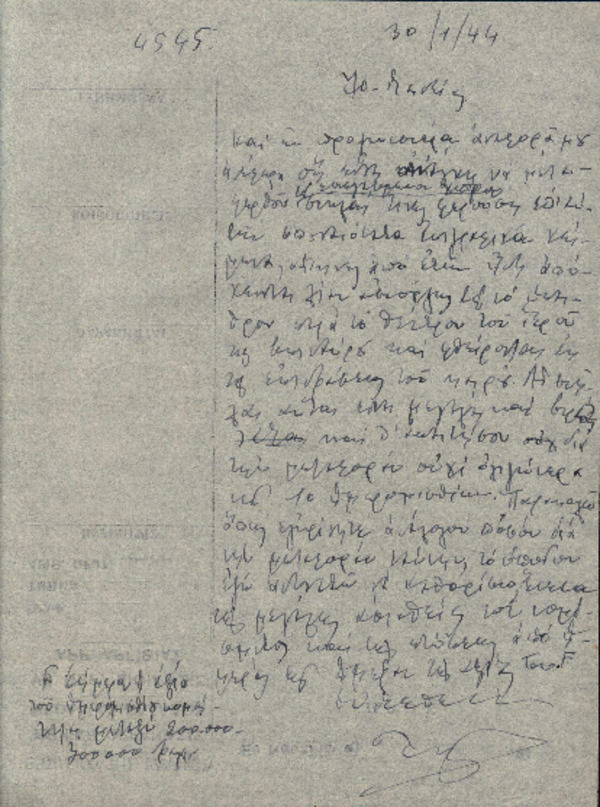 Επιστολή Χ. Πέτρου-Μεσογείτη προς το Υπουργείο Παιδείας με θέμα "Αίτημα πίστωσης για μεταφορά επιγραφικών στηλών" [1944-01-30]