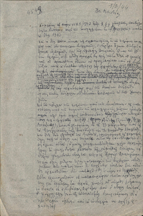 Επιστολή Χ. Πέτρου-Μεσογείτη προς το Υπουργείο Παιδείας με θέμα "Έκθεση πεπραγμένων έτους 1943" [1944-02-01]