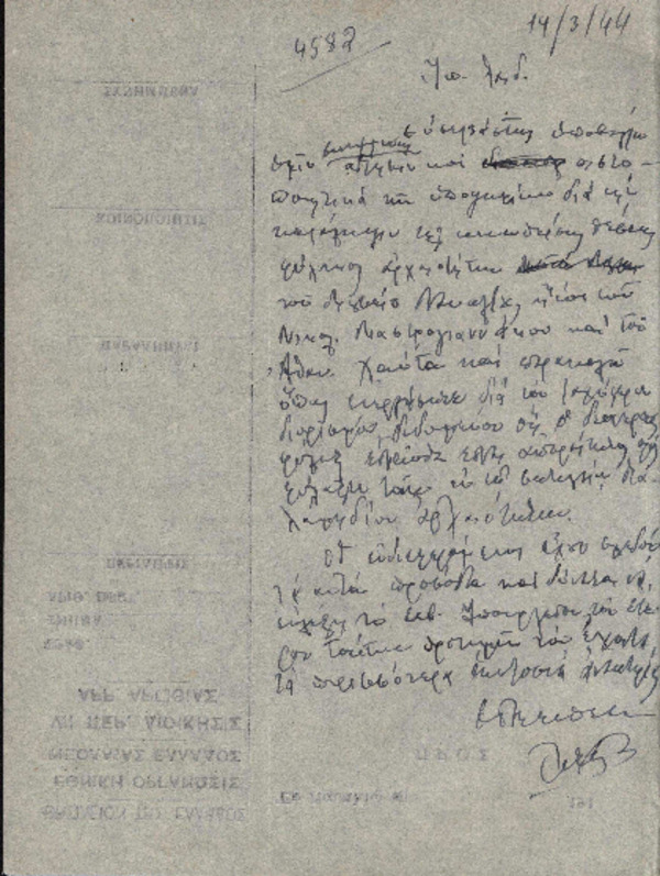 Επιστολή Χ. Πέτρου-Μεσογείτη προς το Υπουργείο Παιδείας με θέμα "Υποψήφιοι θέσης φυλάκα Μουσείου" [1944-03-14]