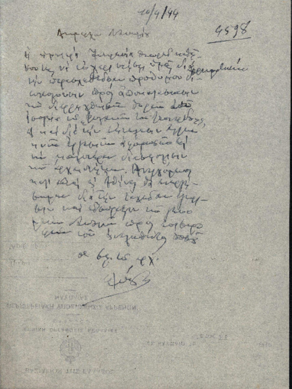 Επιστολή Χ. Πέτρου-Μεσογείτη προς το Δήμαρχο Ναυπλίου με θέμα "Ευχαριστίες για την οικονομική βοήθεια στην επισκευή των Φυλακών Λεονάρδου" [1944-04-10]