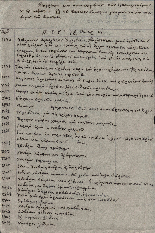 Σημειώσεις Χ. Πέτρου-Μεσογείτη με θέμα "Περιγραφή των ευρημάτων του κιβωτίου 63 του Μουσείου Ναυπλίου κατά αριθμό καταλόγου"
