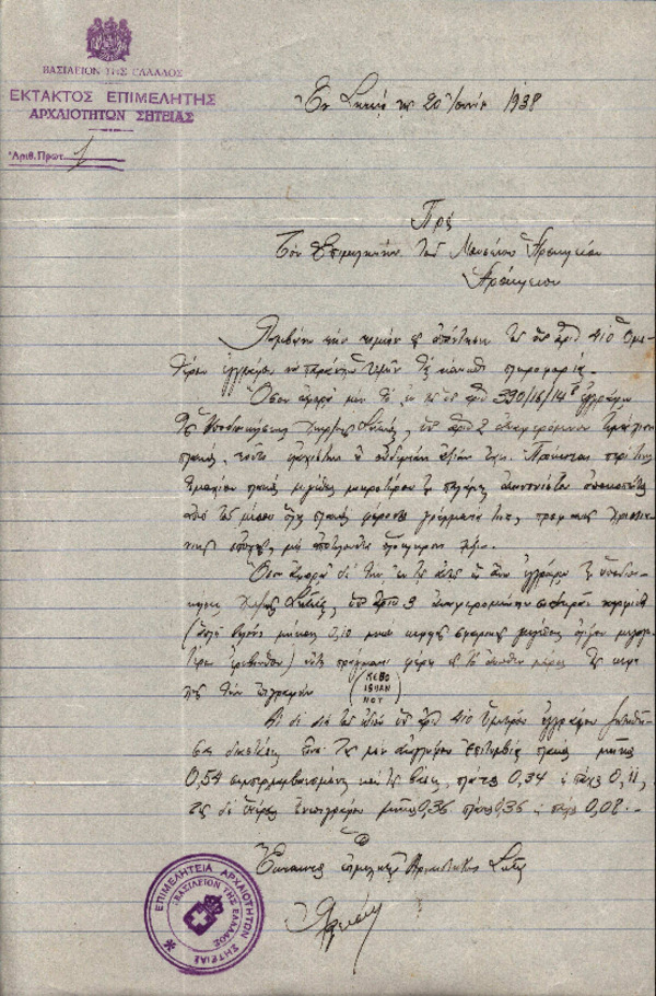 Επιστολή έκτακτου επιμελητή αρχαιοτήτων Σητείας προς τον επιμελητή του Μουσείου Ηρακλείου Χ. Πέτρου-Μεσογείτη με θέμα "Περιγραφή αρχαιολογικών ευρημάτων" [1938-06-20]