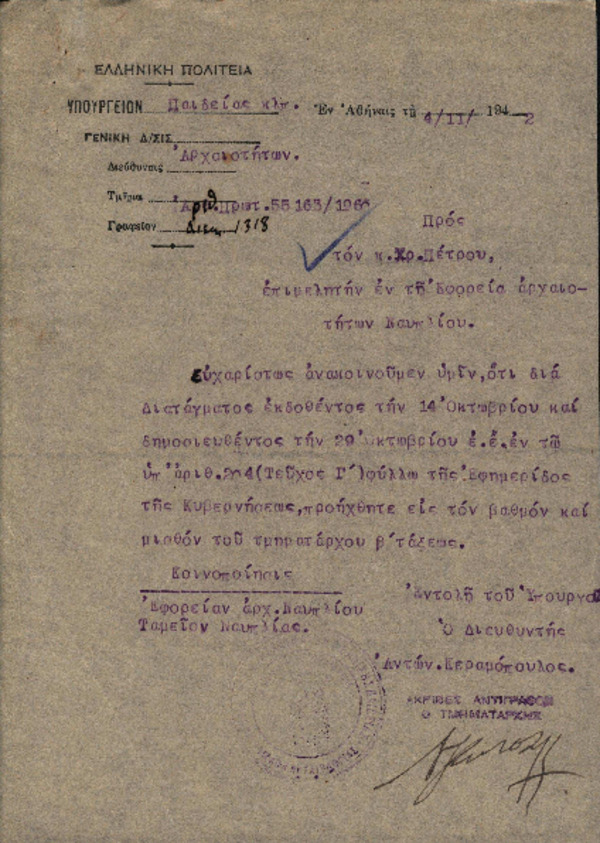 Επιστολή Αντων. Κεραμόπουλου (Διευθυντή Αρχαιοτήτων Υπουργείου Παιδείας) προς τον Χρ. Πέτρου με θέμα "Ανακοίνωση προαγωγής σε Τμηματάρχη β΄ τάξεως" [1940-11-04]