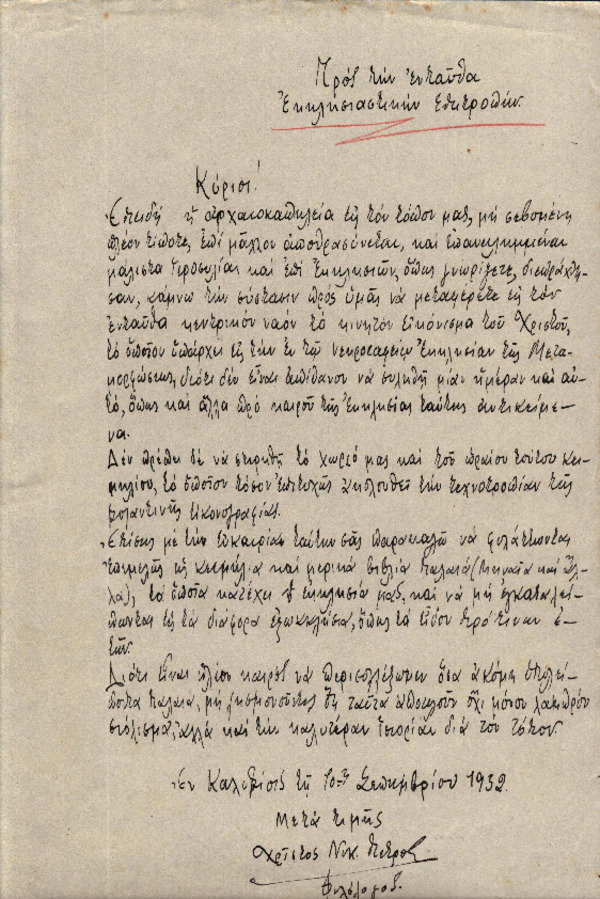 Επιστολή Χ. Πέτρου-Μεσογείτη προς την Εκκλησιαστική Επιτροπή Καλυβίων με θέμα "Προστασία εκκλησιαστικών κειμηλίων από αρχαιοκάπηλους"