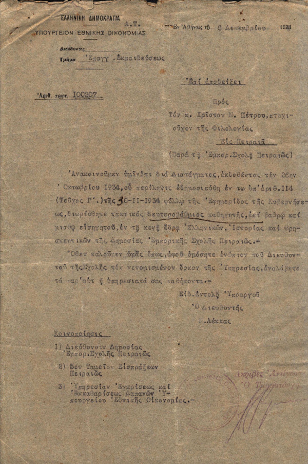 Ανακοίνωση διορισμού στη Δημόσια Εμπορική Σχολή Πειραιά