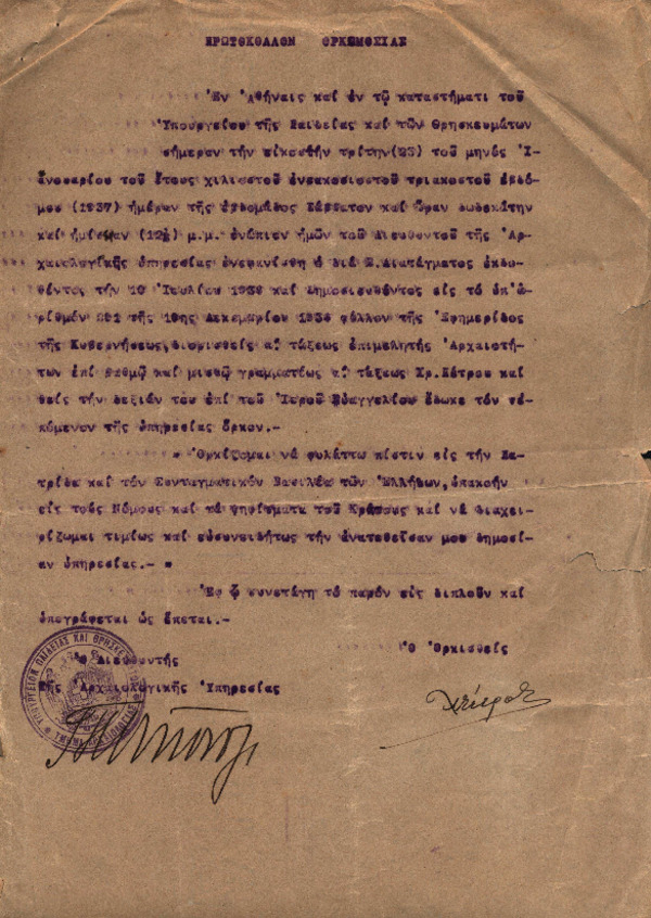 Πρωτόκολλο ορκωμοσίας ως Επιμελητής Αρχαιοτήτων Α΄τάξης