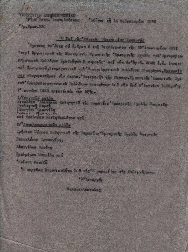 Σύσταση Διοικ. Επιτροπής Νυκτερινής Πρακτικής Εμπορικής Σχολής του Εμποροβιομηχανικού Συλλόγου Προσφύγων [1936-02-14]